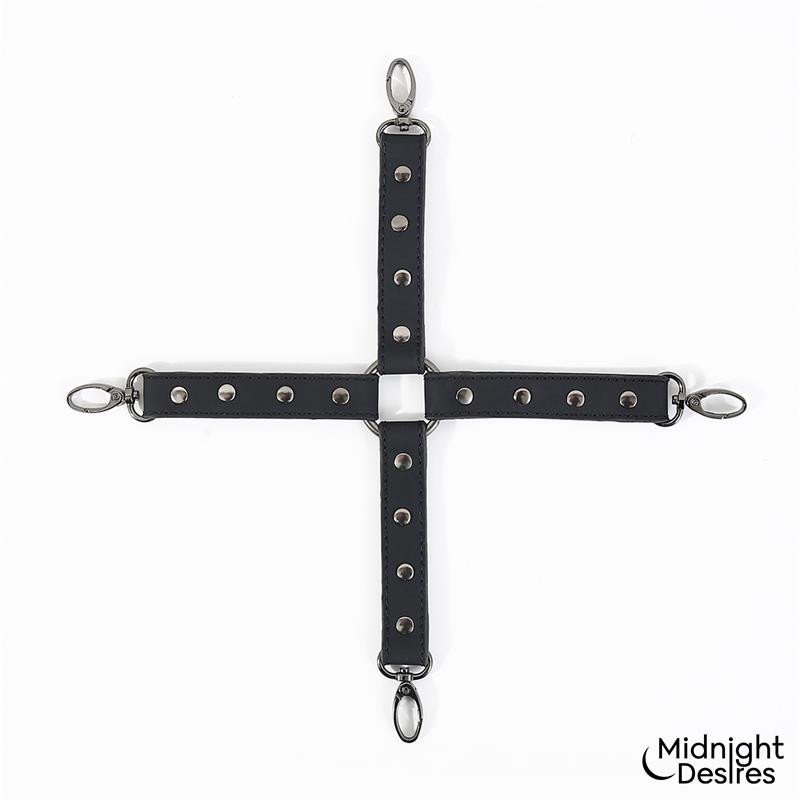 La unión perfecta entre lencería y bondage. Este set cuenta con unas ligas para los muslos y unas esposas para muñecas, todo esto unido con unas restricciones en cruz. Tanto las esposas como las ligas son desmontables y totalmente ajustables con hebillas para una comodidad extra.