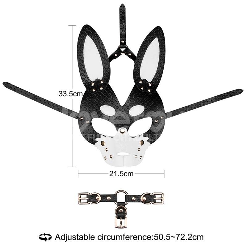 Fabricada en PU de alta calidad, esta máscara presenta un impresionante contraste de dos tonos: una base negra texturizada combinada con nítidos detalles blancos en el hocico, las orejas internas y los detalles de los ojos. Las altas y esculpidas orejas de conejo crean una presencia audaz e imponente, mientras que los adornos de remaches dorados añaden un toque de sofisticación rebelde.