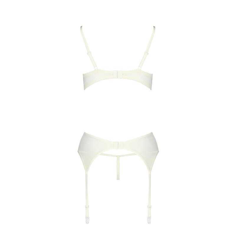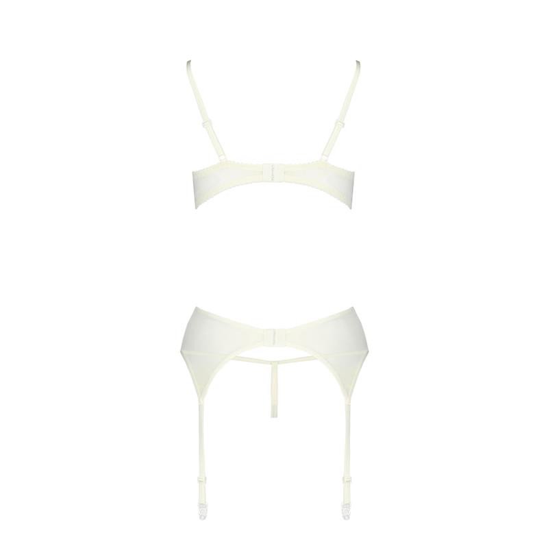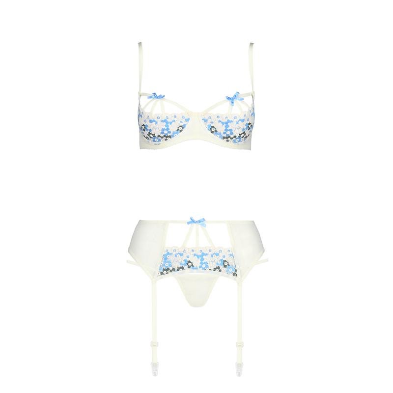 In questo caso, un set molto sensuale in bianco con dettagli blu. Ha dei dettagli molto erotici, un reggiseno con coppe aperte e un reggicalze all'anca da abbinare alle tue calze preferite.