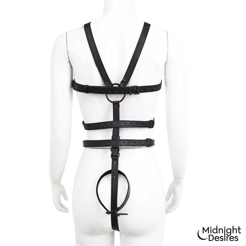 Disfruta de la sumisión más atrevida con este arnés de bondage. Este arnés cuenta con una serie de tiras que abrazan tu cuerpo. Dispones de dos partes esencialmente, la primera es la parte del cuerpo, la cual cuenta con tiras que te rodean los hombros, el pecho, la cintura y la cadera. Por la parte delantera van unidas a 3 aros centrales, y por la parte trasera se unen, en la parte alta de la espalda con otro aro, y en otras tres tiras con hebillas ajustables.