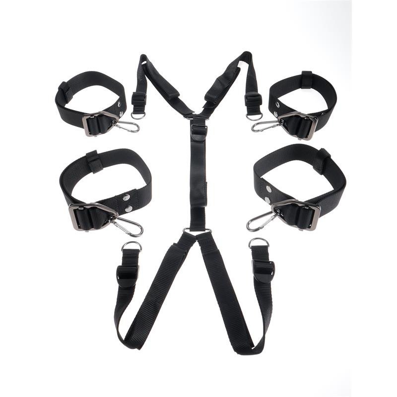 COMANDO. Fatto per giocare duro. Le cinghie bondage sottomaterasso trasformano il tuo letto in un parco giochi bondage. Progettate per scivolare saldamente sotto il materasso, le cinghie in nylon spesse e durevoli a resistenza industriale si attaccano a quattro robusti polsini per impieghi gravosi con anelli di bloccaggio regolabili in acciaio inossidabile, consentendo una vestibilità controllata e personalizzata ogni volta. (Non sono richiesti montanti del letto o testiera.)