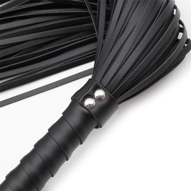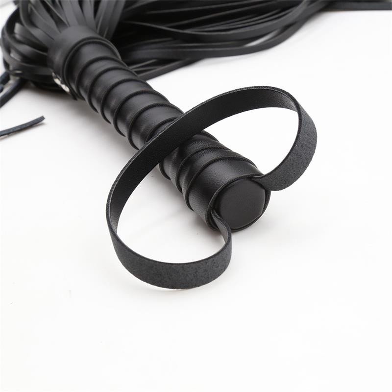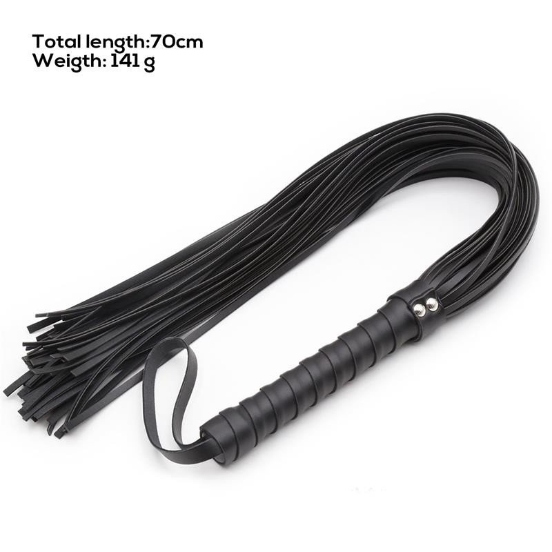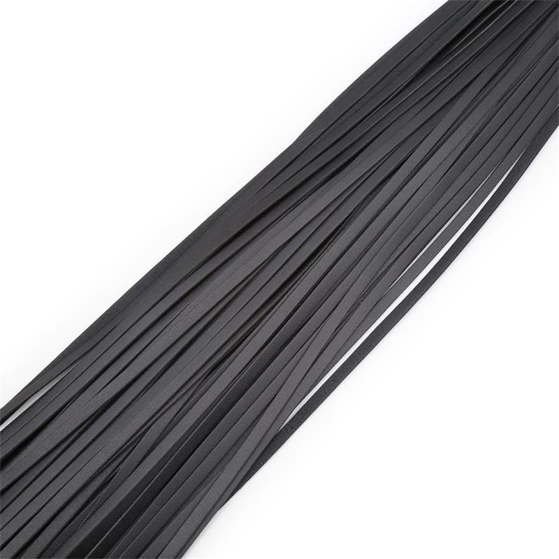 Add that elegant, sensual, and powerful touch to your relationships with this flogger with long string tails. It features an elongated, textured handle and a ring at the end for extra sensual lashing and comfort.