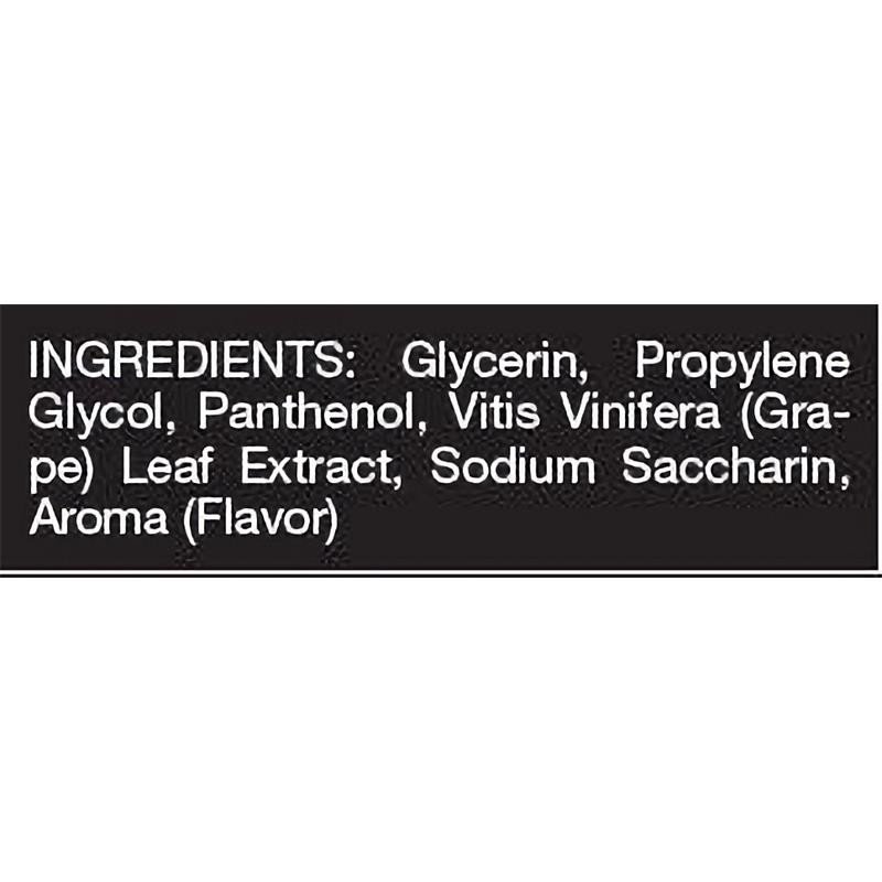 - Ingredienti: glicerina, propilen glicole, pantenolo, estratto di foglie di Vitis Vinifera (uva), saccarina sodica, aroma (aroma)