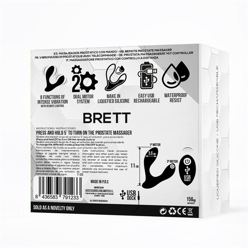 Brett, il massaggiatore prostatico con telecomando che dispone di 2 potenti motori e 8 funzioni di vibrazione.